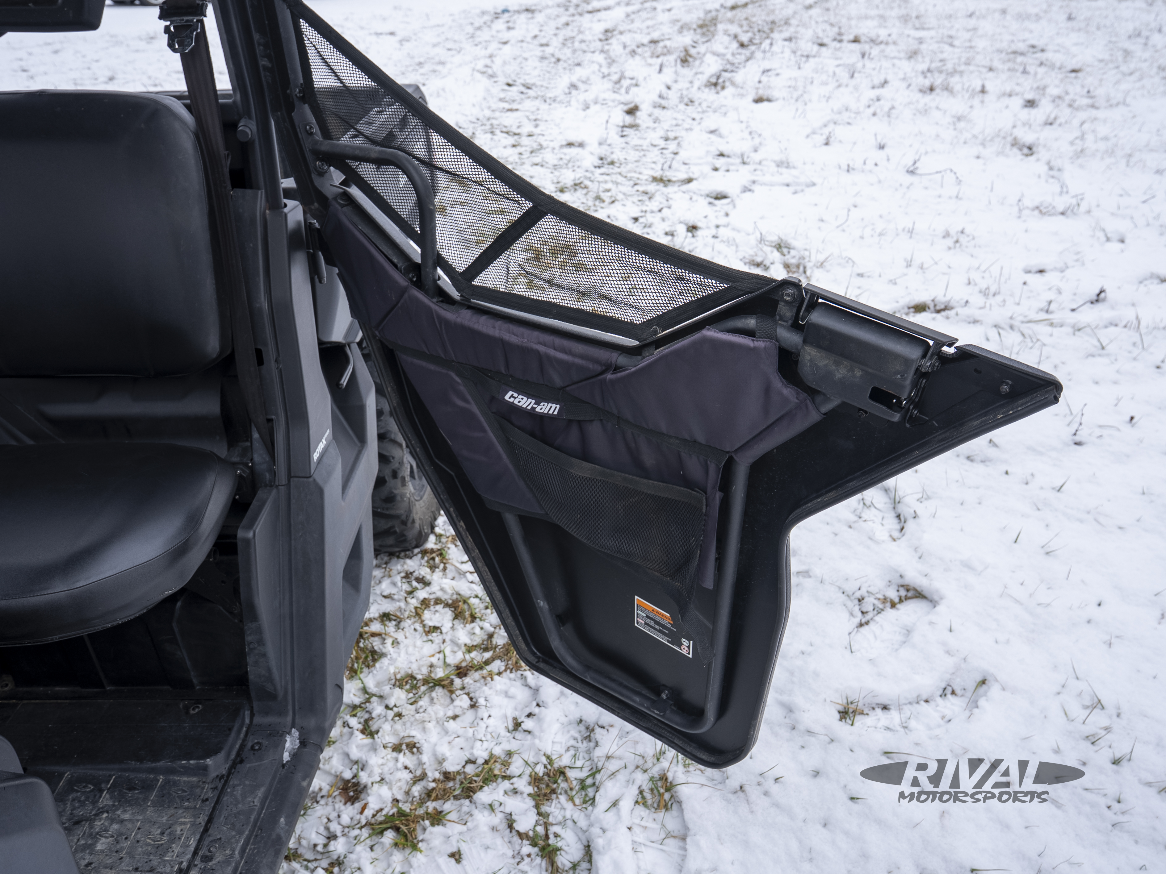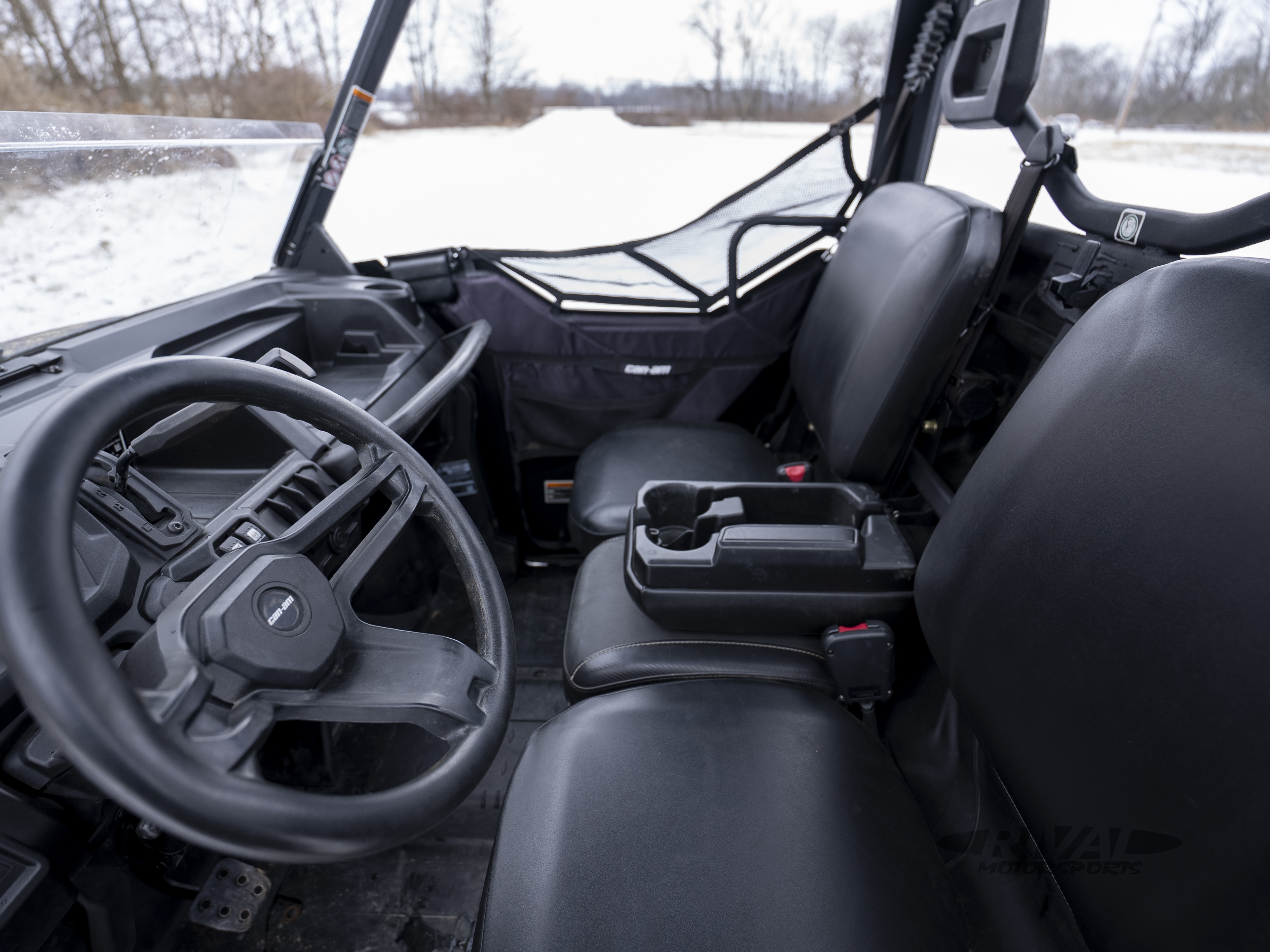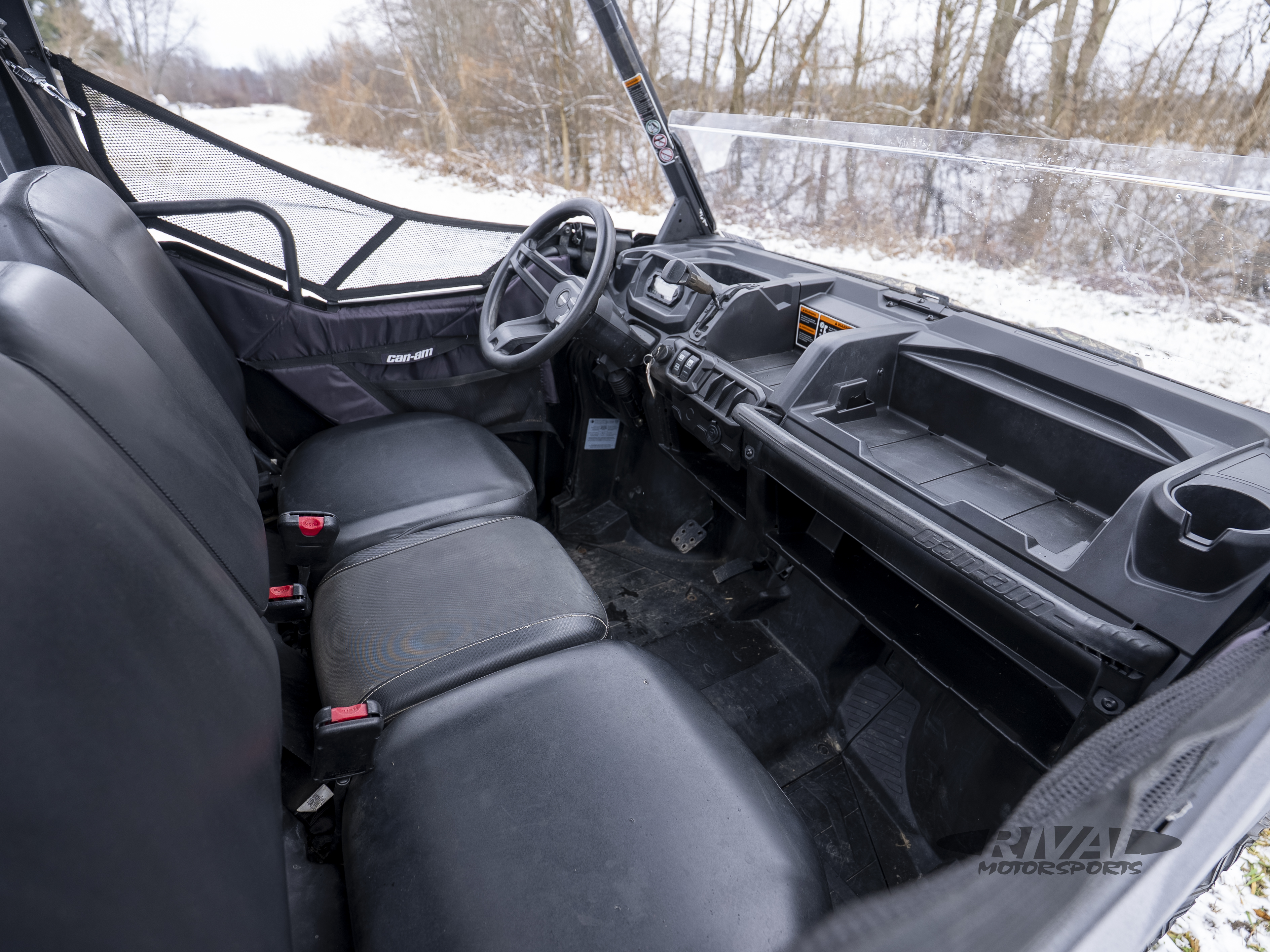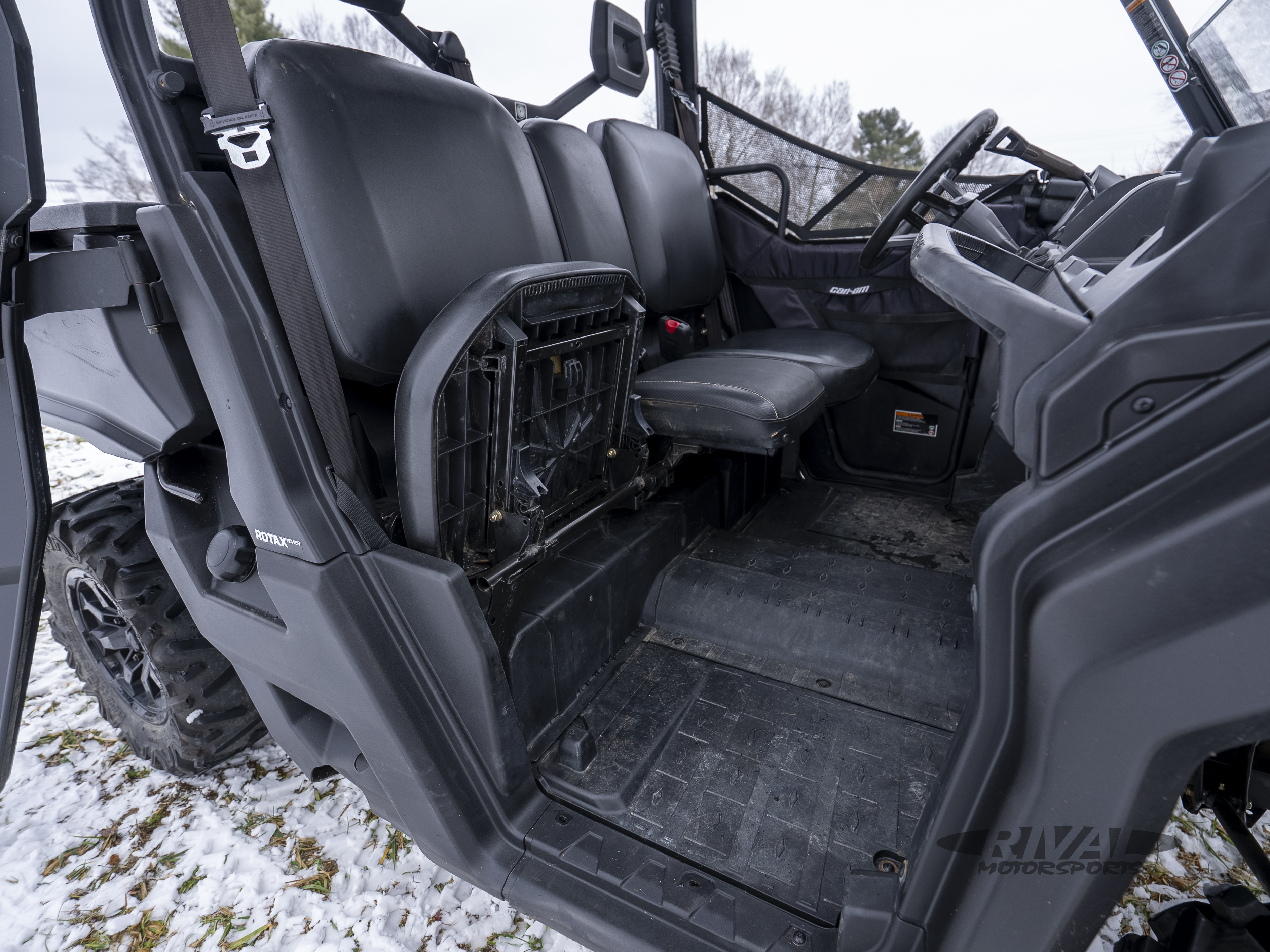 The VERSA-PRO Bench Seat is engineered as a 40/20/40 bench seat, inspired by modern pick-up trucks. It can comfortably accommodate three adults and features profiled corners to improve entrance / exit of the cab as well as a sturdy vinyl cover for improved wear resistance. The passenger seats, complete with integrated hooks on their underside, also can be flipped up to improve onboard storage. Can-Am designers also added a foldable central console and armrest with two cup holders to allow more space in the cab.